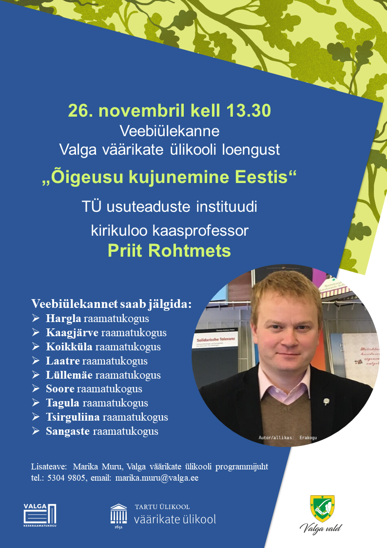 Valga branch libraries invite you to participate in the webcast of the Valga Distinguished University on 26 November at 13.30, where Priit Rohtmets, Associate Professor of Ecclesiastical History at the University of Tartu, will take a look at Orthodox history in Estonia. Orthodoxy has played and continues to play an important role in Estonia, both in cultural life and in social debates. The lecture will give a comprehensive overview of how Orthodoxy has established itself in Estonia throughout history, how [...]