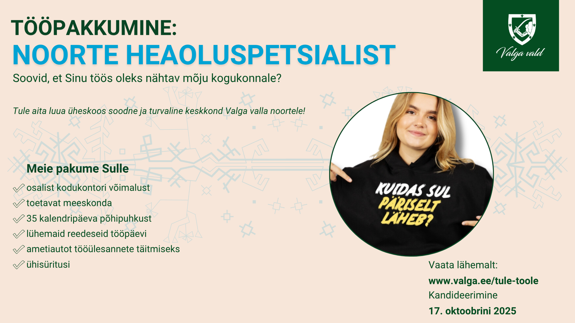 Valga Municipality is seeking to recruit a Youth Welfare Specialist (0.5 posts) to the Social Work Service of the Youth Guarantee Support System (NGTS)....