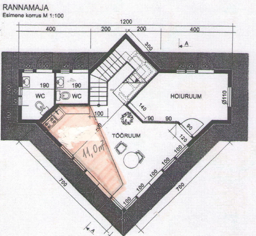 1st floor plan of the building at Perve 30. The space to be made available is marked in red.