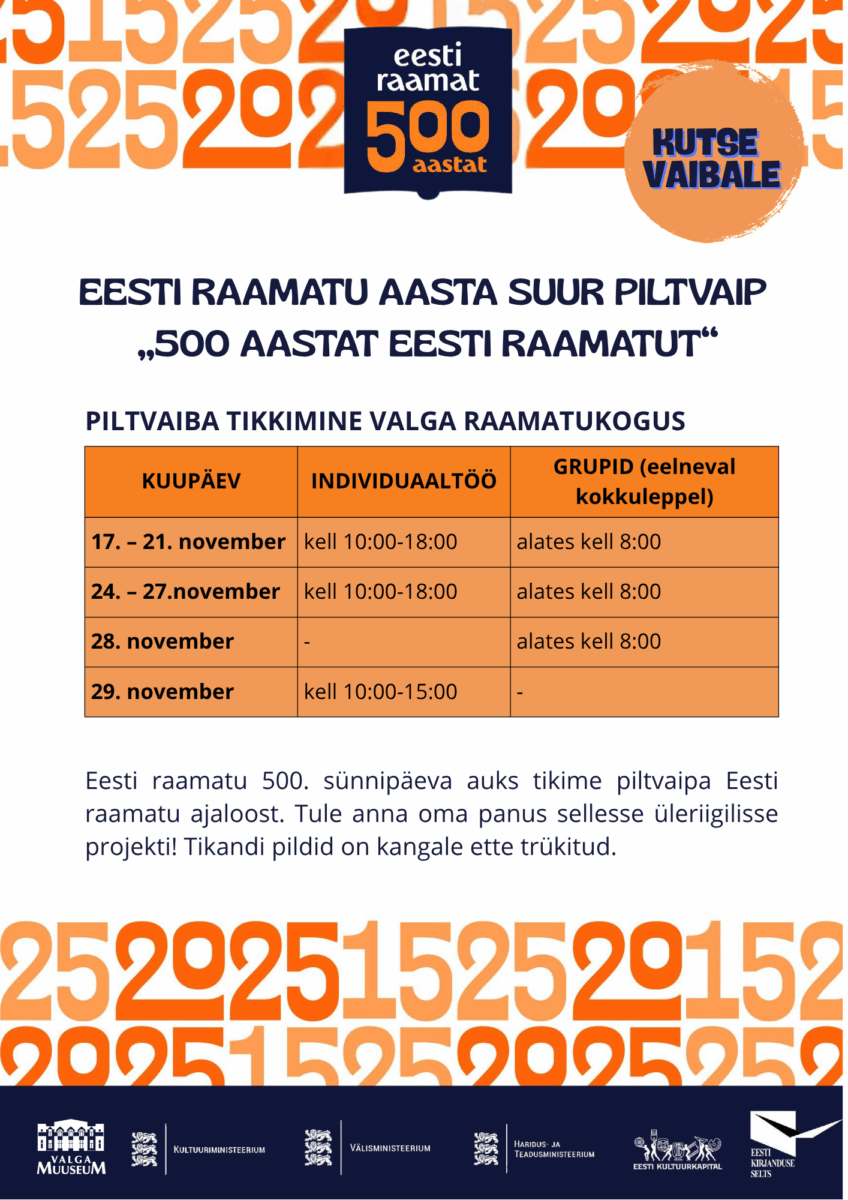Eesti raamatu 500. sünnipäeva auks tikime piltvaipa Eesti raamatu ajaloost. Tule anna oma panus sellesse üleriigilisse projekti! Tikandi pildid on kangale ette trükitud.