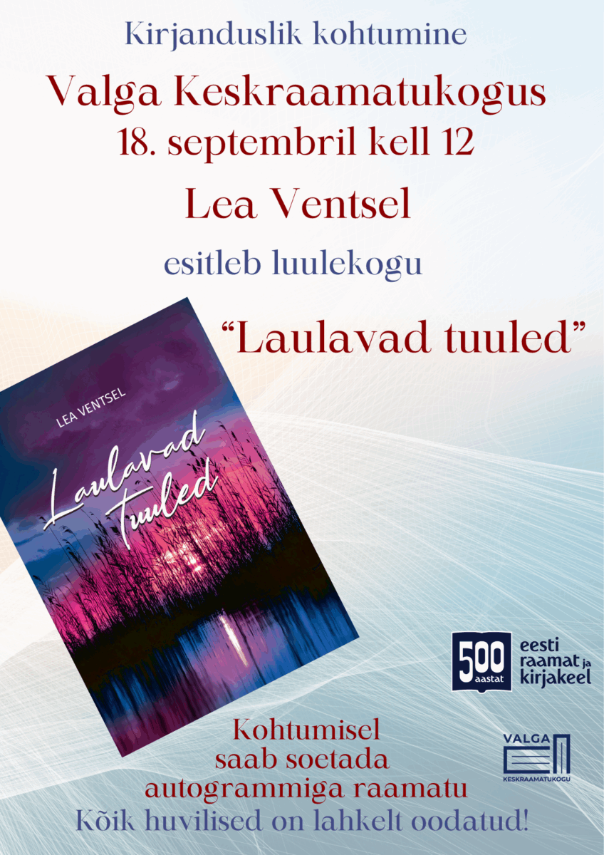 ![]() Kell 12 Valga keskraamatukogus Lea Ventseli vastse luulekogu “Laulavad tuuled” esitlus. Kõik kirjandushuvilised on oodatud. Kohapeal võimalus osta raamat.