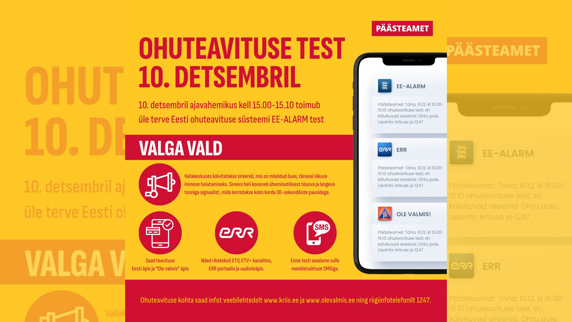 Päästeamet testib kolmapäeval, 10. detsembril ohuteavituse süsteemi EE-ALARM. Sel päeval käivitatakse kõik ohuteavituse kanalid, sh…